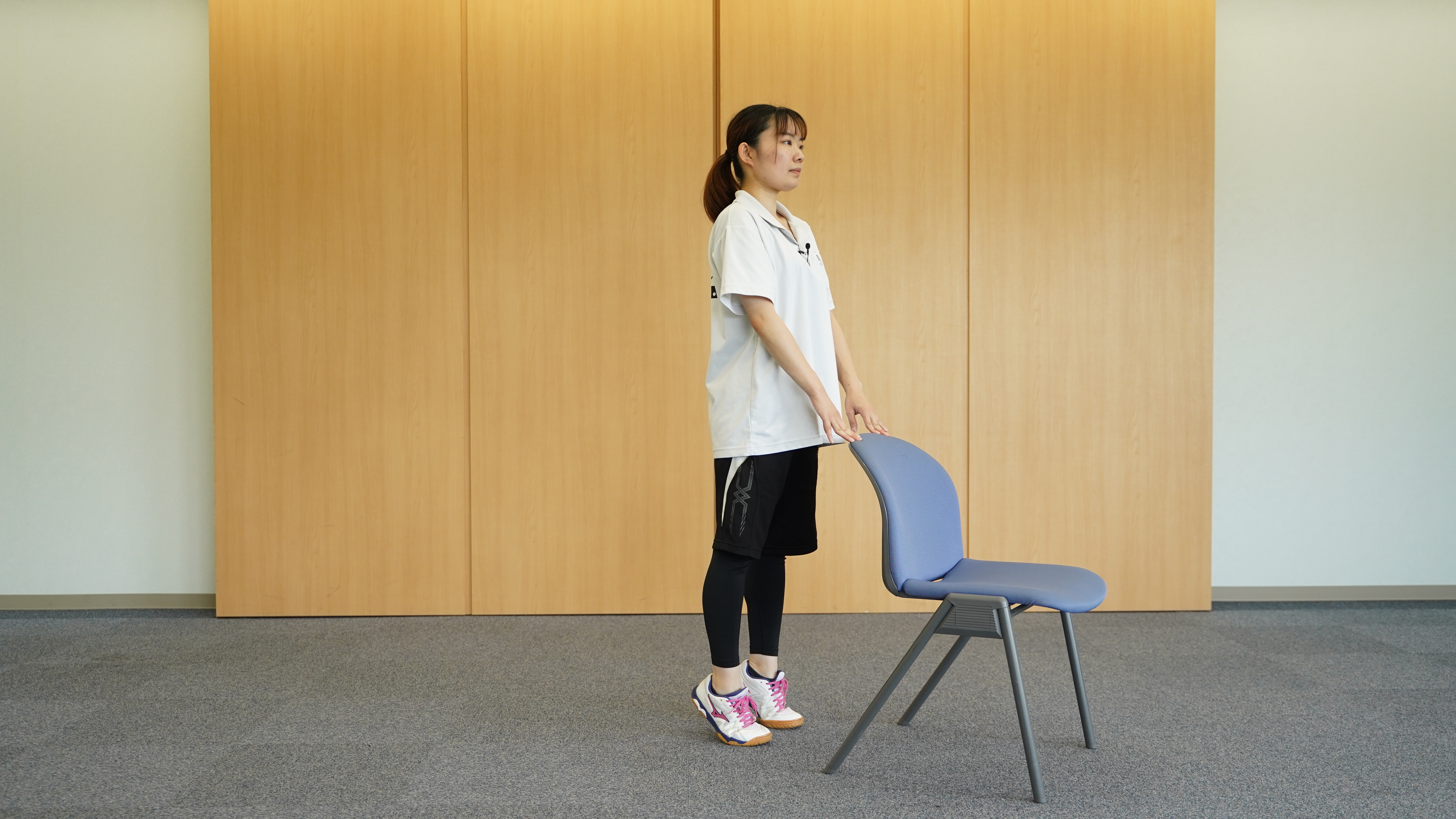 ①椅子、机、壁などの支えになるものを両手で支えながら、足を軽く開いて構えましょう