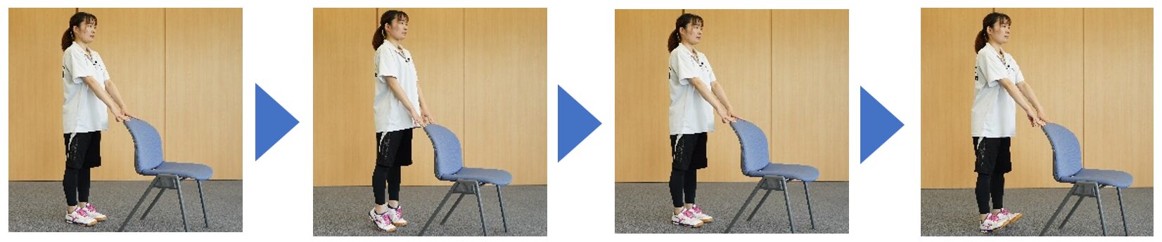 また、かかとを持ち上げる力は歩く際に床を押して前に進む力に、つま先を持ち上げる力は歩く際につま先を持ち上げてかかとから着地する力に繋がります。